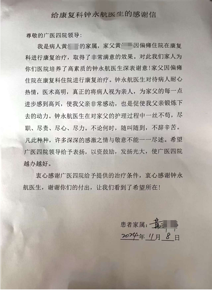 信中,患者黃大爺?shù)募覍賹?duì)鐘永航同學(xué)給予了高度評(píng)價(jià)。黃大爺因偏癱住院,在廣醫(yī)四院康復(fù)科進(jìn)行康復(fù)治療。在治療期間,鐘永航傾注了極大的耐心與熱情,確保每一個(gè)康復(fù)動(dòng)作都能精準(zhǔn)到位,每一個(gè)訓(xùn)練環(huán)節(jié)都能達(dá)到預(yù)期效果,為患者的每一次進(jìn)步感到由衷的高興。鐘永航不僅展現(xiàn)了其專業(yè)技能的精湛,更以一顆溫暖而堅(jiān)定的心,贏得了患者及家屬的深深信賴。