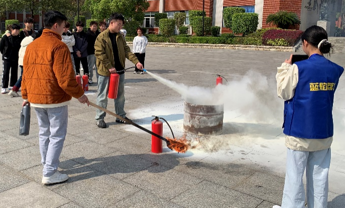 撤離到安全地帶,立即進行人員清點,確保所有人員安全撤離。隨后保衛(wèi)處消防安全員組織演練師生在綜合樓廣場進行消防滅火演練,向師生介紹滅火器的正確使用方法,師生們分組有序且踴躍進行了現(xiàn)場滅火器的操作訓(xùn)練。
