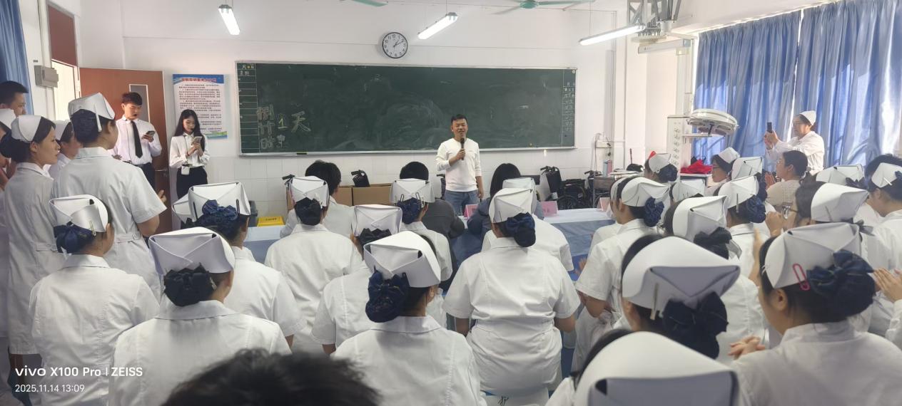 比賽當(dāng)日,現(xiàn)場(chǎng)氣氛緊張而熱烈,寬敞明亮的實(shí)訓(xùn)室內(nèi),擺放著整齊的護(hù)理操作臺(tái),每張操作臺(tái)上都配備了完備的靜脈輸液所需物品。參賽同學(xué)們身著整潔的護(hù)士服,頭戴護(hù)士帽,整齊列隊(duì),眼神中透露出期待與興奮。健康學(xué)院劉偉鑫副院長發(fā)表了講話:他首先對(duì)本次比賽的順利舉辦表示熱烈祝賀,并鼓勵(lì)同學(xué)們道:“同學(xué)們,護(hù)理工作是一項(xiàng)承載著生命與希望的神圣事業(yè),它不僅需要扎實(shí)的專業(yè)技能,更要有高度的責(zé)任感和無私的奉獻(xiàn)精神。今天的靜脈輸液技能比賽,是你們展示自我、提升能力的重要平臺(tái)。希望同學(xué)們能夠珍惜這次機(jī)會(huì),賽出風(fēng)格,賽出水平。無論比賽結(jié)果如何,都要把這次經(jīng)歷當(dāng)作成長道路上的寶貴財(cái)富,不斷努力學(xué)習(xí)和實(shí)踐,在未來的護(hù)理生涯中,用愛心、耐心和精湛技藝,成為患者信賴的守護(hù)者。”