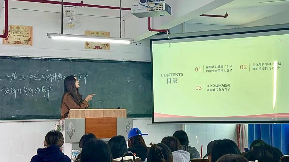 陳老師生動(dòng)闡釋道:“黨的二十屆四中全會(huì)為國(guó)家發(fā)展擘畫(huà)了宏偉藍(lán)圖,更與我們每位青年學(xué)子的成長(zhǎng)成才緊密相連?!彼貜?qiáng)調(diào),2025年是“十四五“ 收官與“十五五”謀劃的關(guān)鍵之年,深入學(xué)習(xí)全會(huì)精神,是青年學(xué)子認(rèn)清時(shí)代方位、找準(zhǔn)人生航向的 “必修課”,能幫助大家在專業(yè)學(xué)習(xí)與人生規(guī)劃中明確方向、積蓄?yuàn)^進(jìn)力量。