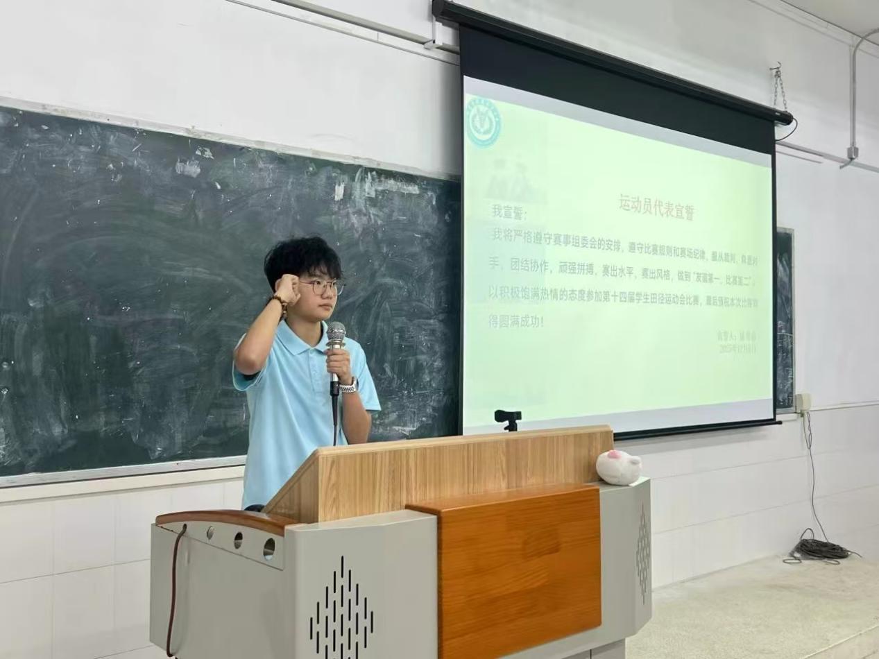 運(yùn)動(dòng)員代表陳彗嘉同學(xué)發(fā)言并宣誓,她表示“青春逐夢(mèng),賽場(chǎng)礪志”,全體運(yùn)動(dòng)員將以昂揚(yáng)姿態(tài)全力以赴,堅(jiān)定信念、奮勇拼搏,嚴(yán)守規(guī)則、文明參賽,用汗水書寫熱血與擔(dān)當(dāng),不負(fù)韶華、不負(fù)熱愛,全力沖刺創(chuàng)造佳績(jī)。志愿者代表張梓瑩同學(xué)也作出鄭重表態(tài),她以“以志愿之名,赴青春之約”為初心,承諾志愿者團(tuán)隊(duì)將堅(jiān)守崗位、恪盡職守,熱情服務(wù)、全力護(hù)航,用責(zé)任與擔(dān)當(dāng)保障賽事順利進(jìn)行,以赤誠(chéng)初心傳遞溫暖力量。