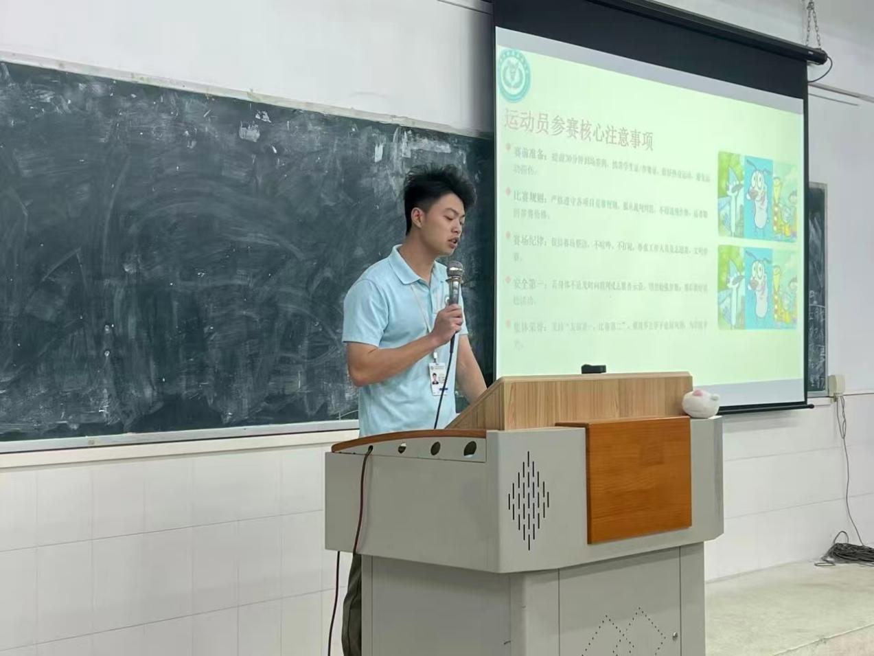 會(huì)上,王騰輝同學(xué)向大家提出以下的相關(guān)要求:運(yùn)動(dòng)員需提前30分鐘到場(chǎng)簽到、攜有效證件熱身,嚴(yán)守競(jìng)賽規(guī)則與賽場(chǎng)紀(jì)律,秉持“安全第一、友誼為先”原則文明參賽;志愿者需提前1小時(shí)到崗,著裝規(guī)范、熱情盡責(zé),服從安排并保障自身與服務(wù)對(duì)象安全。