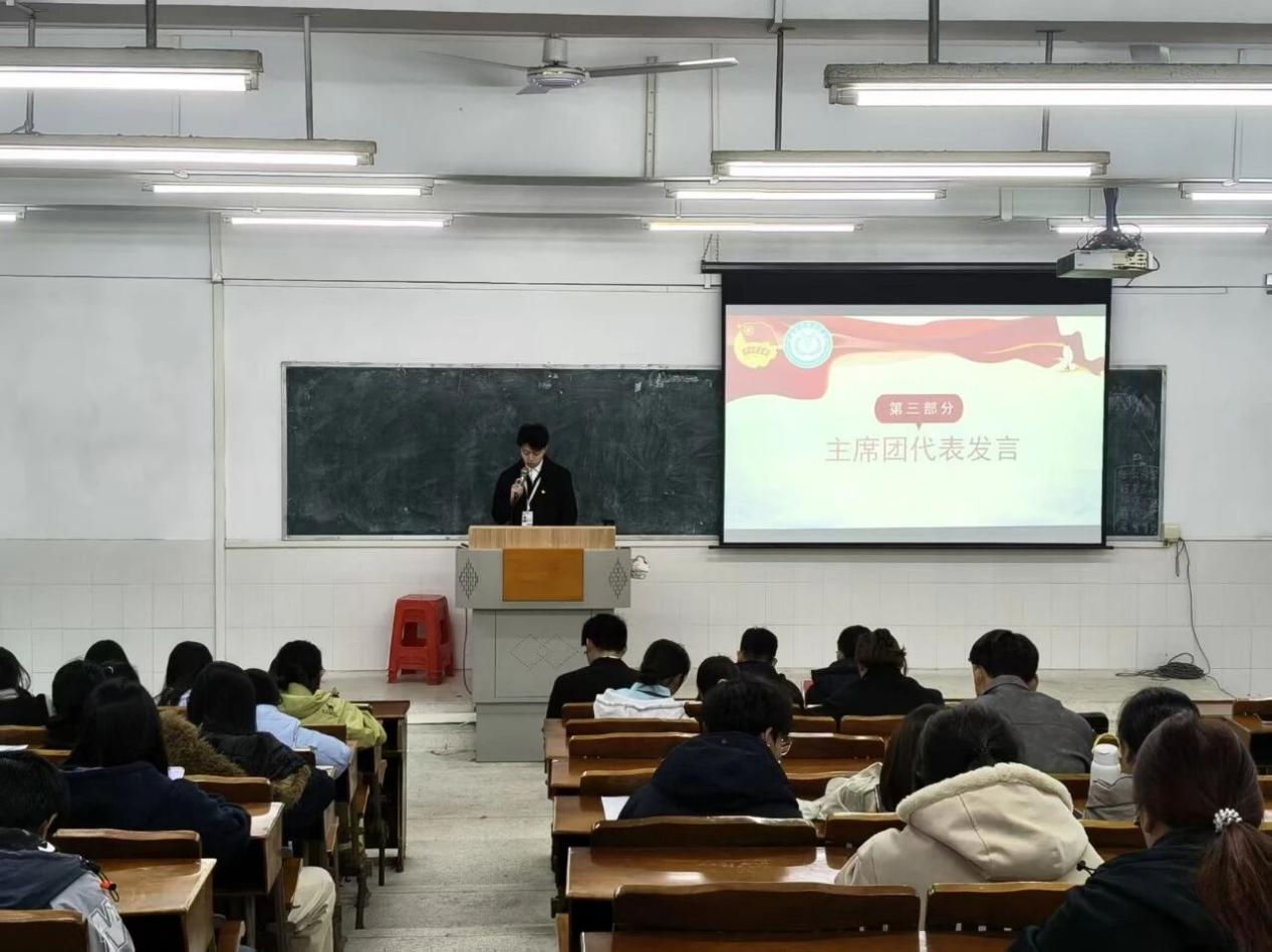 隨后,主席團代表上臺述職。代表全面復盤本學期迎新活動、社團招新、班級大合唱、校運會、學風建設演講比賽及校外服務等重點工作成效,同時直面部門協(xié)同質效不高、創(chuàng)新實踐活力不足等短板,明確優(yōu)化方向,并寄語全體團學成員深耕實干、篤行致遠,送上前程似錦的誠摯祝福。