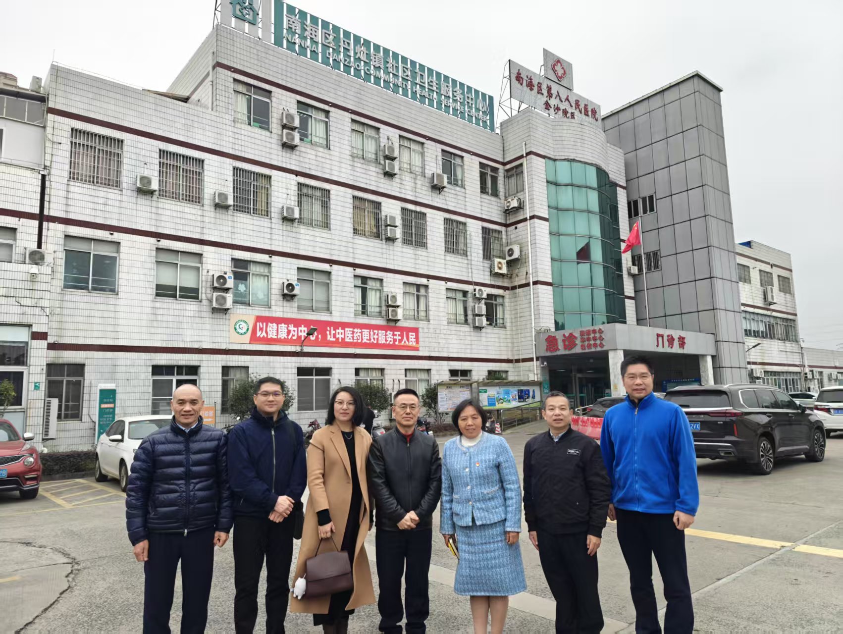 健康學(xué)院羅琴芳博士參觀兒童一體化門診,與丹灶社區(qū)衛(wèi)生服務(wù)中心何立華主任等負(fù)責(zé)人樓前合影