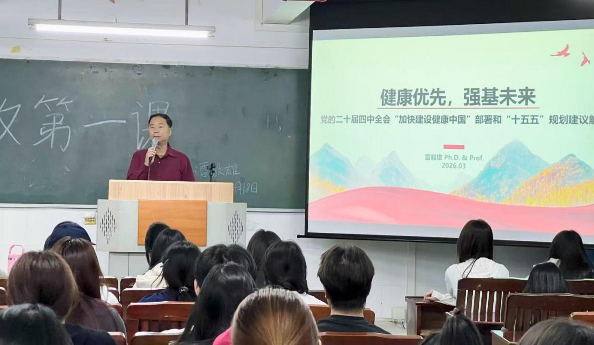 2026年3月18日晚,健康學(xué)院新學(xué)期思政第一課在西三教學(xué)樓601教室開(kāi)講,課程以“健康優(yōu)先,強(qiáng)基未來(lái)”為主題,深入學(xué)習(xí)貫徹黨的二十屆四中全會(huì)精神,引導(dǎo)青年學(xué)子深刻領(lǐng)會(huì)“加快建設(shè)健康中國(guó)”戰(zhàn)略部署和“十五五”規(guī)劃建議核心要義,厚植服務(wù)人民健康事業(yè)的使命擔(dān)當(dāng)。本次課程由健康學(xué)院院長(zhǎng)雷毅雄同志主講,學(xué)院學(xué)子齊聚課堂、專(zhuān)注聆聽(tīng),在學(xué)習(xí)中凝聚思想共識(shí)。