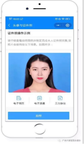 第五步:點擊“我的簡歷”中的頭像,上傳符合要求的免冠照片,系統(tǒng)即可快速生成藍(lán)色背景的證件照片。照片可適用于簡歷、派遣、電子就業(yè)協(xié)議等系統(tǒng)中的多個服務(wù)場景(證件照片經(jīng)過公安部后臺校驗,符合國家證件照標(biāo)準(zhǔn))。