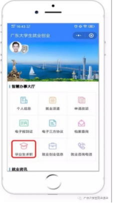 第二步:點擊“畢業(yè)生求職”模塊,如已綁定學(xué)籍的同學(xué)即可完善簡歷并投遞。