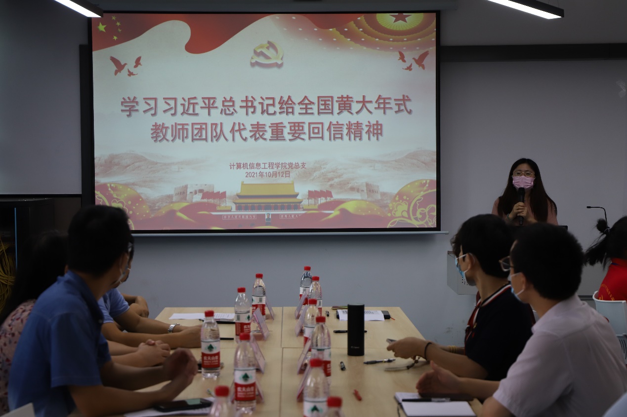計算機信息工程學院黨總支于2021年10月12日星期二中午13:00在西三501教室舉行了學習習近平總書記給全國黃大年式教師團隊代表重要回信精神。出席本次大會的人員有:黨總支書記王建華同志,黨總支副書記郭麗純同志,計算機信息工程學院全體教師黨員同志。會議由郭麗純同志主持。