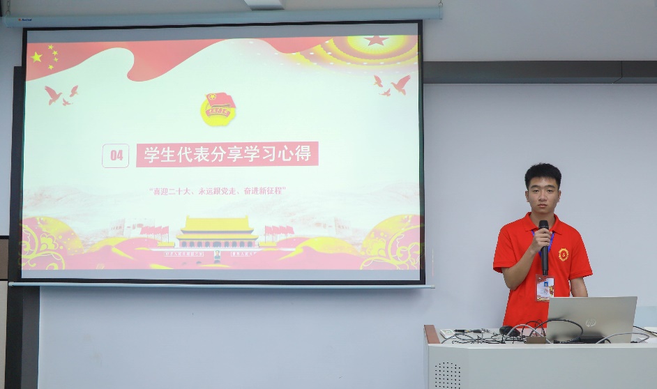 緊接著由學(xué)生代表阮夢婷同學(xué)以及第31期入黨積極分子代表楊康健同學(xué)上臺分享學(xué)習(xí)體會,阮夢婷同學(xué)說到:習(xí)近平總書記在慶祝中國共產(chǎn)主義青年團(tuán)成立100周年大會的重要講話中,提到了“新時代的中國青年,生逢其時、重任在肩,施展才干的舞臺無比廣闊,實現(xiàn)夢想的前景無比光明。”對此我深有感悟,追求進(jìn)步,是青年最寶貴的特質(zhì),也是黨和人民最殷切的希望。作為新時代的中國青年,生逢其時、重任在肩,我們應(yīng)積極投身人民群眾的壯闊實踐,在民族復(fù)興征程上勇當(dāng)先鋒、傾情奉獻(xiàn),增強(qiáng)做中國人的志氣、骨氣、底氣,踐行“請黨放心,強(qiáng)國有我”的錚錚誓言。