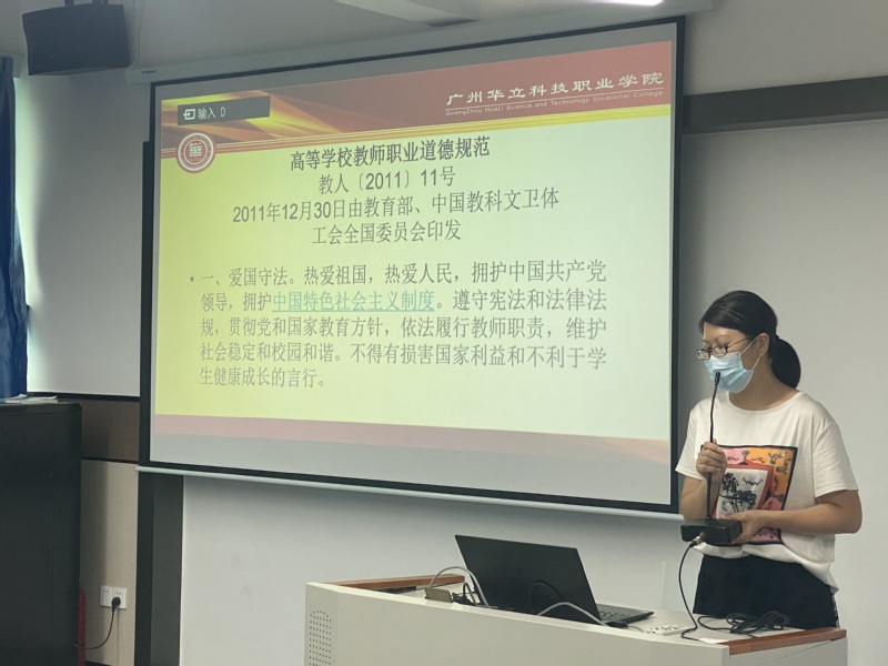 接著王蘭豐老師就師德師風(fēng)相關(guān)法律法規(guī),以及《廣州華立科技職業(yè)學(xué)院教師職業(yè)行為負(fù)面清單及處理辦法》,《廣州華立科技職業(yè)學(xué)院師德承諾制度》,《廣州華立科技職業(yè)學(xué)院師德考核制度》,《華立園十要十不準(zhǔn)》等進(jìn)行講解。