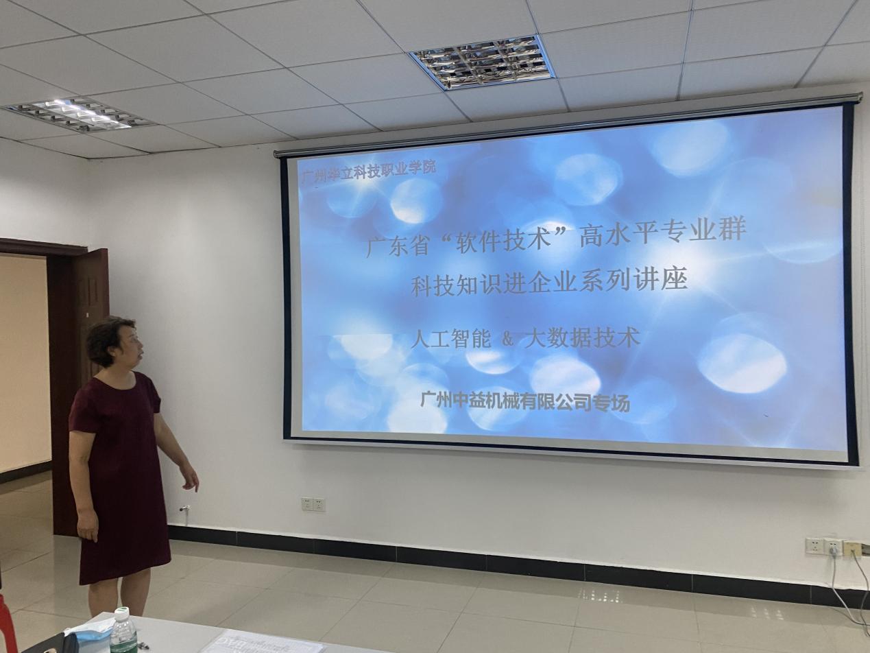 廣州華立科技職業(yè)學(xué)院“軟件技術(shù)”省級高水平專業(yè)群在服務(wù)社會的2年工作中,先后為增城區(qū)高新企業(yè)開發(fā)小程序、開設(shè)科技講座等,得到了企業(yè)歡迎和認(rèn)同,建立了多家校企合作項(xiàng)目。2022年9月27日,我院應(yīng)校企單位廣州中益機(jī)械有限公司邀請,特派學(xué)科帶頭人李麗萍教授為企業(yè)全體員工開展《人工智能&大數(shù)據(jù)》方面新技術(shù)的知識普及講座。