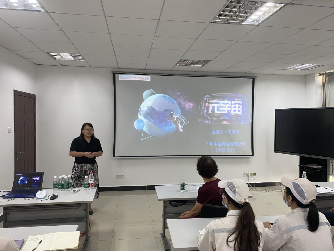 廣州華立科技職業(yè)學(xué)院“軟件技術(shù)”省級高水平專業(yè)群在服務(wù)社會的2年工作中,先后為增城區(qū)高新企業(yè)開發(fā)小程序、開設(shè)科技講座等,得到了企業(yè)歡迎和認(rèn)同,建立了多家校企合作項目。2022年9月27日,我院應(yīng)校企單位廣州中益機械有限公司邀請,特派教學(xué)主任閔小翠副教授為企業(yè)全體員工開展《元宇宙》方面新技術(shù)的知識普及講座。