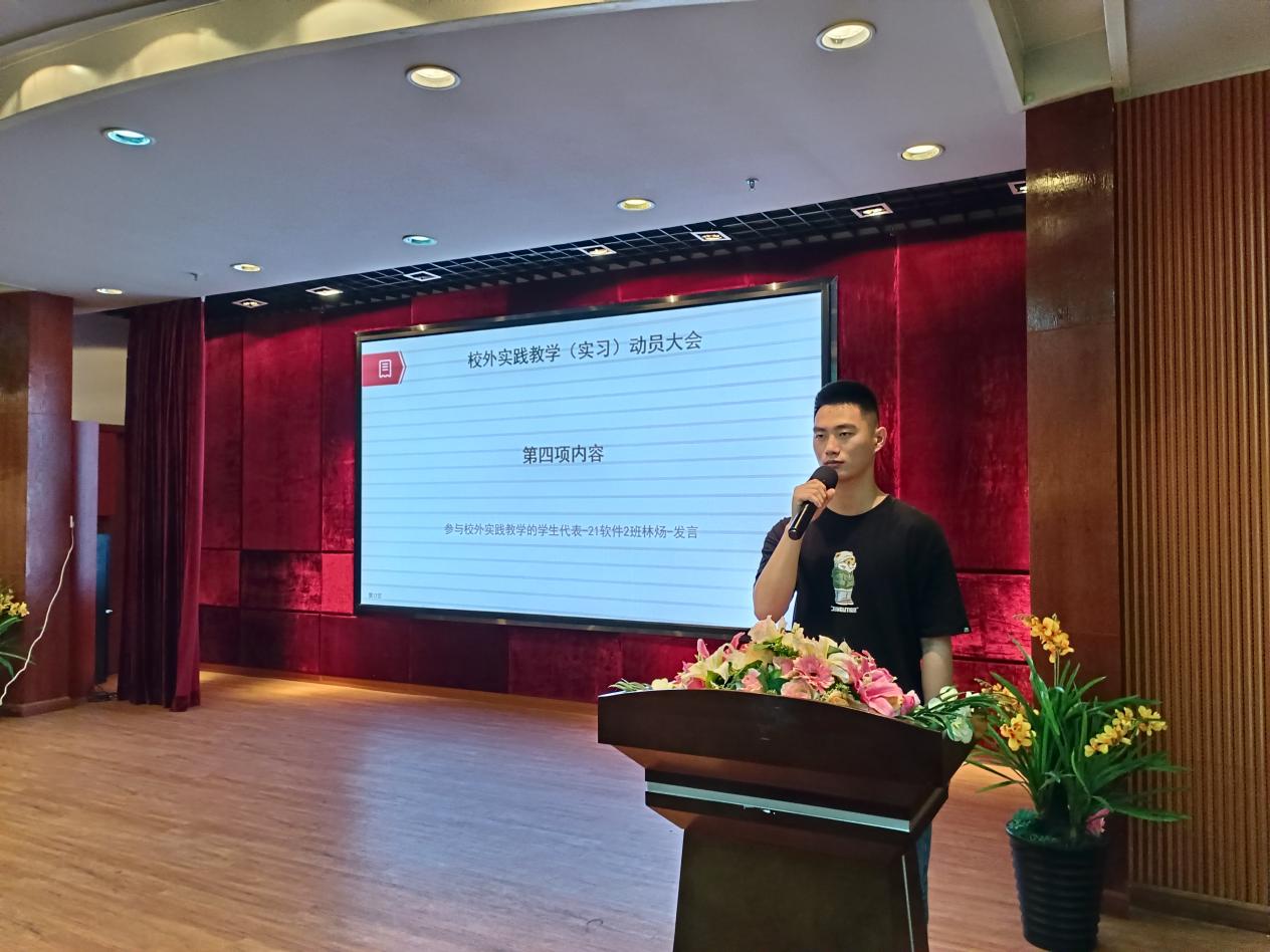 然后是參與校外實(shí)踐教學(xué)的2021級(jí)學(xué)生代表發(fā)言:會(huì)時(shí)刻牢記;走進(jìn)學(xué)校是主人,走出學(xué)校是代表。我們將在社會(huì)上以優(yōu)異的實(shí)習(xí)成績,展示自己的才華,證明自己的價(jià)值,回報(bào)師長,回報(bào)母校,回報(bào)一切關(guān)心我們的人。
