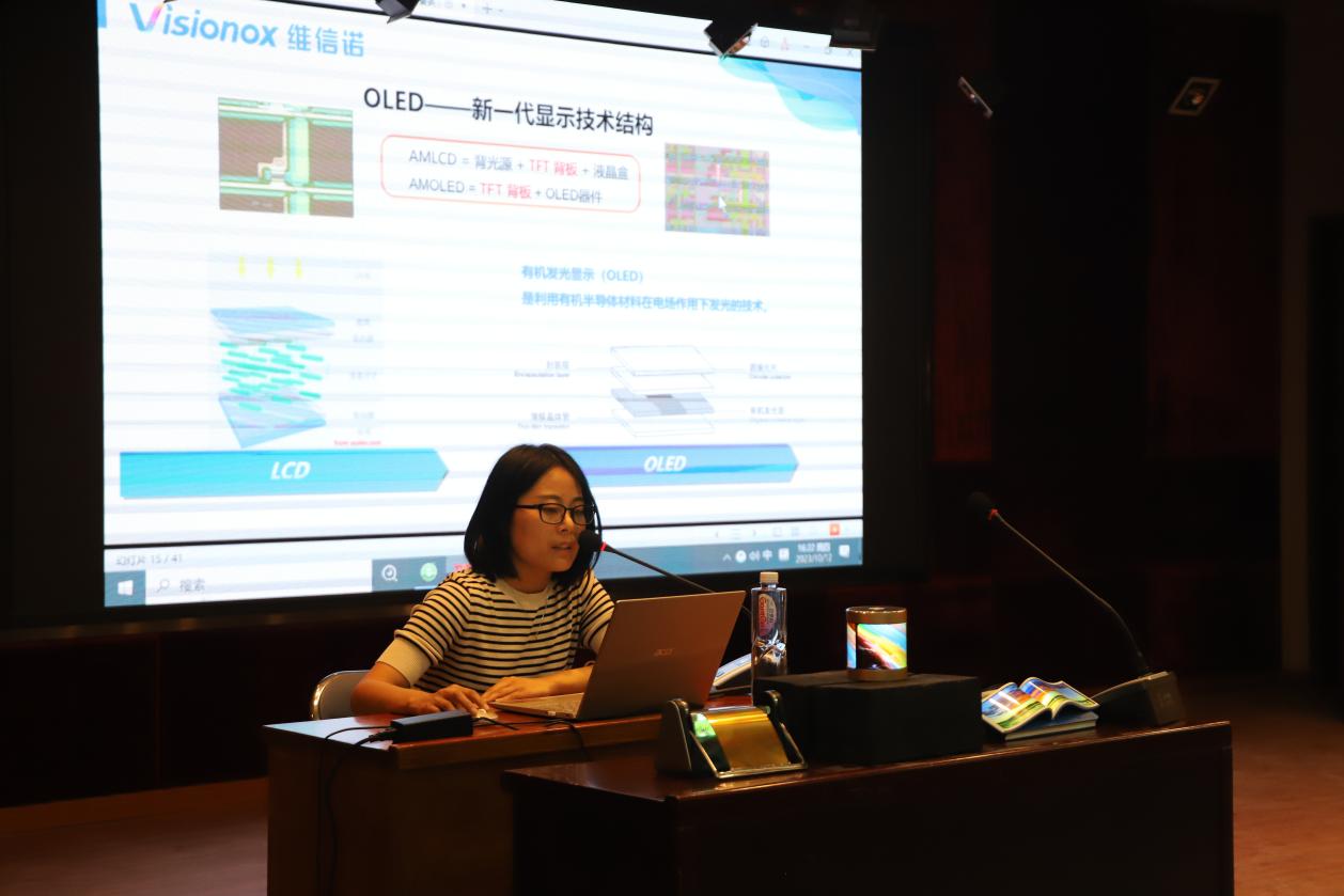 維信諾公司的曹英老師,作為失效分析組的主管,為在場(chǎng)師生分享了顯示技術(shù)的奧秘。她在講座中介紹了顯示技術(shù)的基本原理,以及OLED(有機(jī)發(fā)光二極管)的工作原理和應(yīng)用。尤其引人入勝的是,曹英老師詳細(xì)探討了柔性OLED的前景和在多個(gè)領(lǐng)域的應(yīng)用,引領(lǐng)觀眾們走進(jìn)未來(lái)的顯示科技世界。