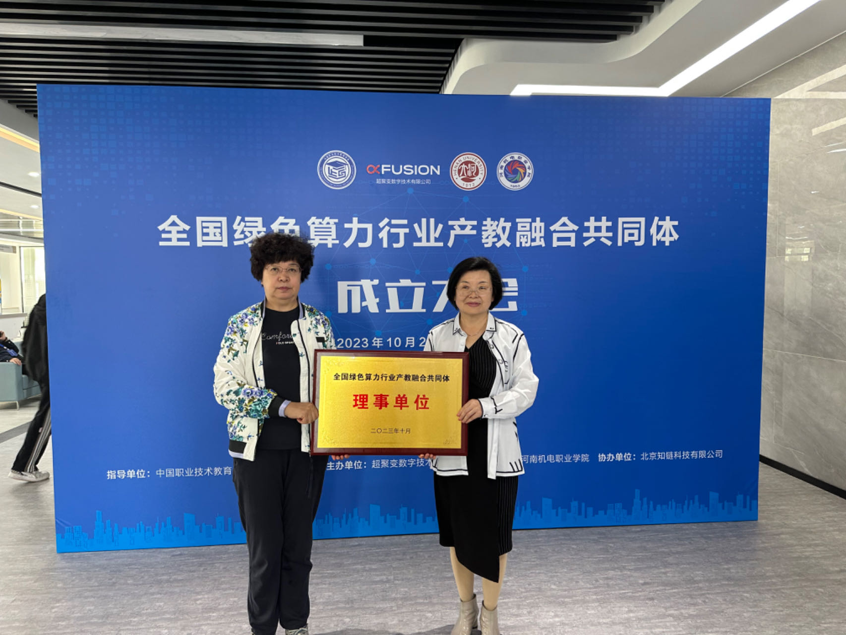 全國綠色算力行業(yè)產(chǎn)教融合共同體成立大會2023年10月29日在河南鄭州召開,河南省政府教育督導(dǎo)委員會、河南省教育廳相關(guān)領(lǐng)導(dǎo)以及來自全國高水平大學(xué)、職業(yè)院校、算力產(chǎn)業(yè)上下游企業(yè)、科研機構(gòu)和行業(yè)協(xié)會等197家成員單位的領(lǐng)導(dǎo)、嘉賓出席會議。我校作為理事單位,由計算機信息工程學(xué)院王建華院長代表學(xué)校參會并接受理事單位授牌。