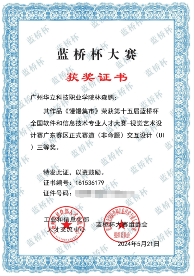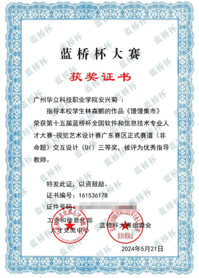 近日,我院傳來喜訊。在第十五屆藍(lán)橋杯全國軟件和信息技術(shù)專業(yè)人才大賽中,我院學(xué)子林森鵬的作品《饅饅集市》榮獲視覺藝術(shù)設(shè)計賽廣東賽區(qū)正式賽道(非命題)交互設(shè)計(UI)三等獎,指導(dǎo)教師安興菊、孫夢琳兩位老師榮獲優(yōu)秀指導(dǎo)教師獎。這一榮譽不僅是對學(xué)生個人能力的肯定,也體現(xiàn)了學(xué)院在信息技術(shù)和藝術(shù)設(shè)計教育領(lǐng)域的卓越成果。