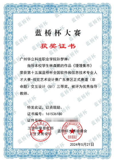 近日,我院傳來喜訊。在第十五屆藍橋杯全國軟件和信息技術(shù)專業(yè)人才大賽中,我院學(xué)子林森鵬的作品《饅饅集市》榮獲視覺藝術(shù)設(shè)計賽廣東賽區(qū)正式賽道(非命題)交互設(shè)計(UI)三等獎,指導(dǎo)教師安興菊、孫夢琳兩位老師榮獲優(yōu)秀指導(dǎo)教師獎。這一榮譽不僅是對學(xué)生個人能力的肯定,也體現(xiàn)了學(xué)院在信息技術(shù)和藝術(shù)設(shè)計教育領(lǐng)域的卓越成果。