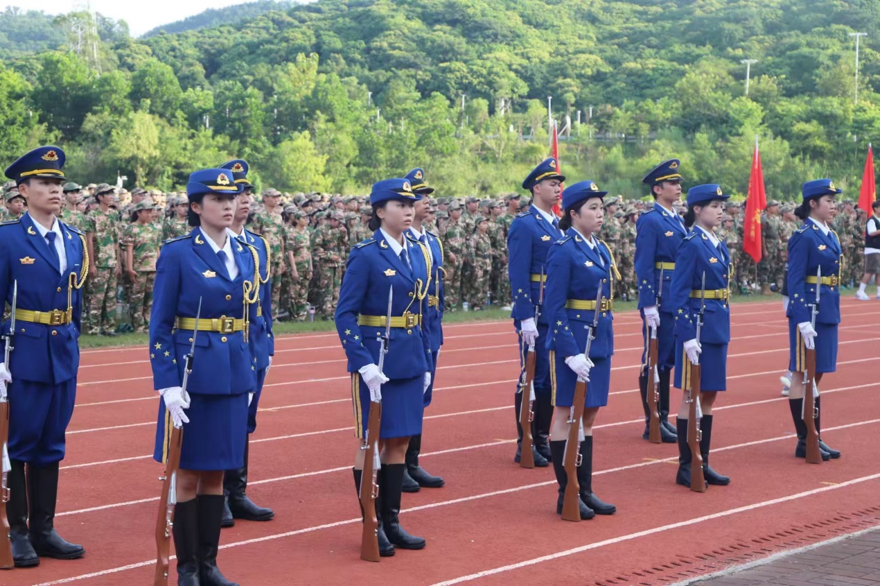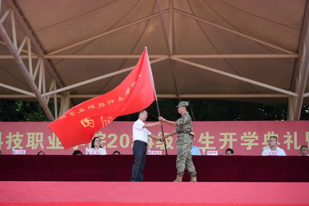 黨委書記陳良聲同志向承訓(xùn)部隊授軍訓(xùn)團團旗。隨著鮮艷的軍訓(xùn)團旗緩緩升起并交接到軍訓(xùn)團領(lǐng)導(dǎo)手中,全場響起了雷鳴般的掌聲和歡呼聲。這面旗幟不僅代表著學(xué)校對軍訓(xùn)工作的重視和支持,更寄托著學(xué)校對全體新生的殷切期望和美好祝愿。
