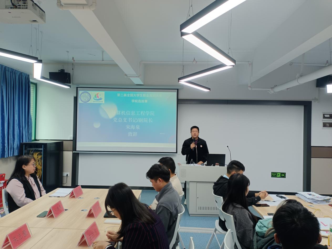 比賽伊始,計(jì)算機(jī)學(xué)院黨總支書記宋海泉發(fā)表了熱情洋溢的開場辭。他強(qiáng)調(diào)了職業(yè)規(guī)劃對(duì)于大學(xué)生成長成才的重要性,鼓勵(lì)參賽選手們以此次大賽為契機(jī),深入探索自我,明確職業(yè)目標(biāo),展現(xiàn)出計(jì)算機(jī)學(xué)院學(xué)子積極向上、勇于探索的精神風(fēng)貌。宋書記的致辭為比賽拉開了序幕,也讓選手們更加深刻地認(rèn)識(shí)到本次大賽的意義與價(jià)值。