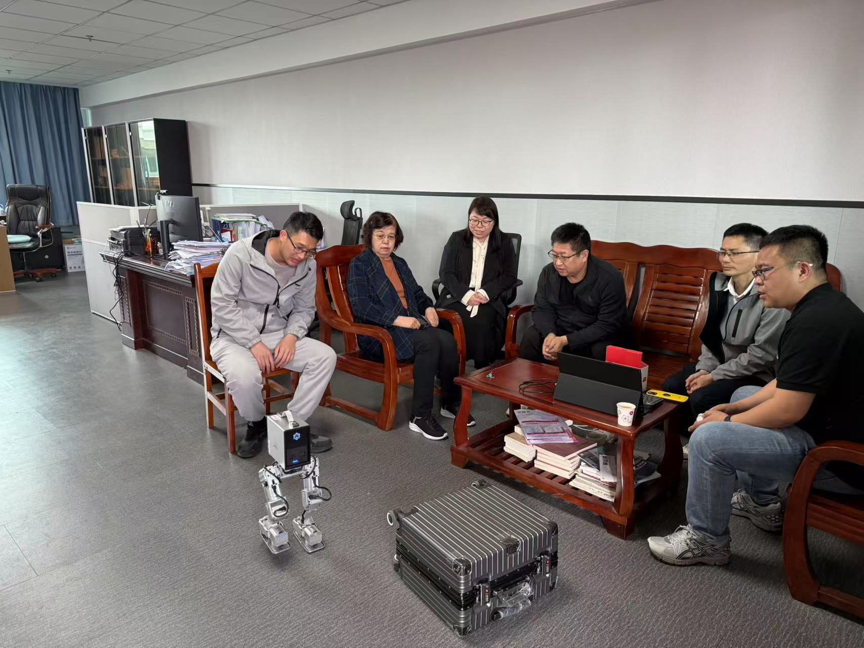 廣州靈動方程科技有限公司任總監(jiān)向?qū)W院領導們展示最新上市的兩足機器人,并表示該款機器人現(xiàn)在供不應求,企業(yè)正加速擴大生產(chǎn)線,希望能與學院開展訂單式培養(yǎng),為企業(yè)輸送符合崗位需求的技能人才,解決企業(yè)的用人難題。