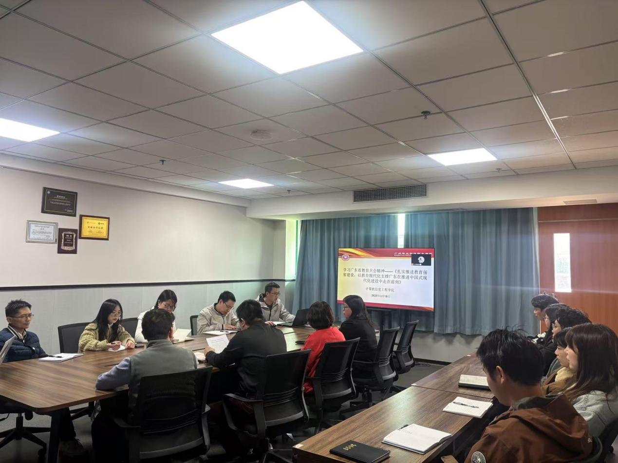為深入學習貫徹習近平總書記重要講話精神、全國教育大會精神和廣東省教育大會精神,進一步凝聚思想共識、強化使命擔當,推動黨中央關于建設教育強國的重大決策部署落實落地。2025年3月19日,我院召開全體教師大會共同學習廣東省教育大會精神,會議由黨總支書記宋海泉主持。