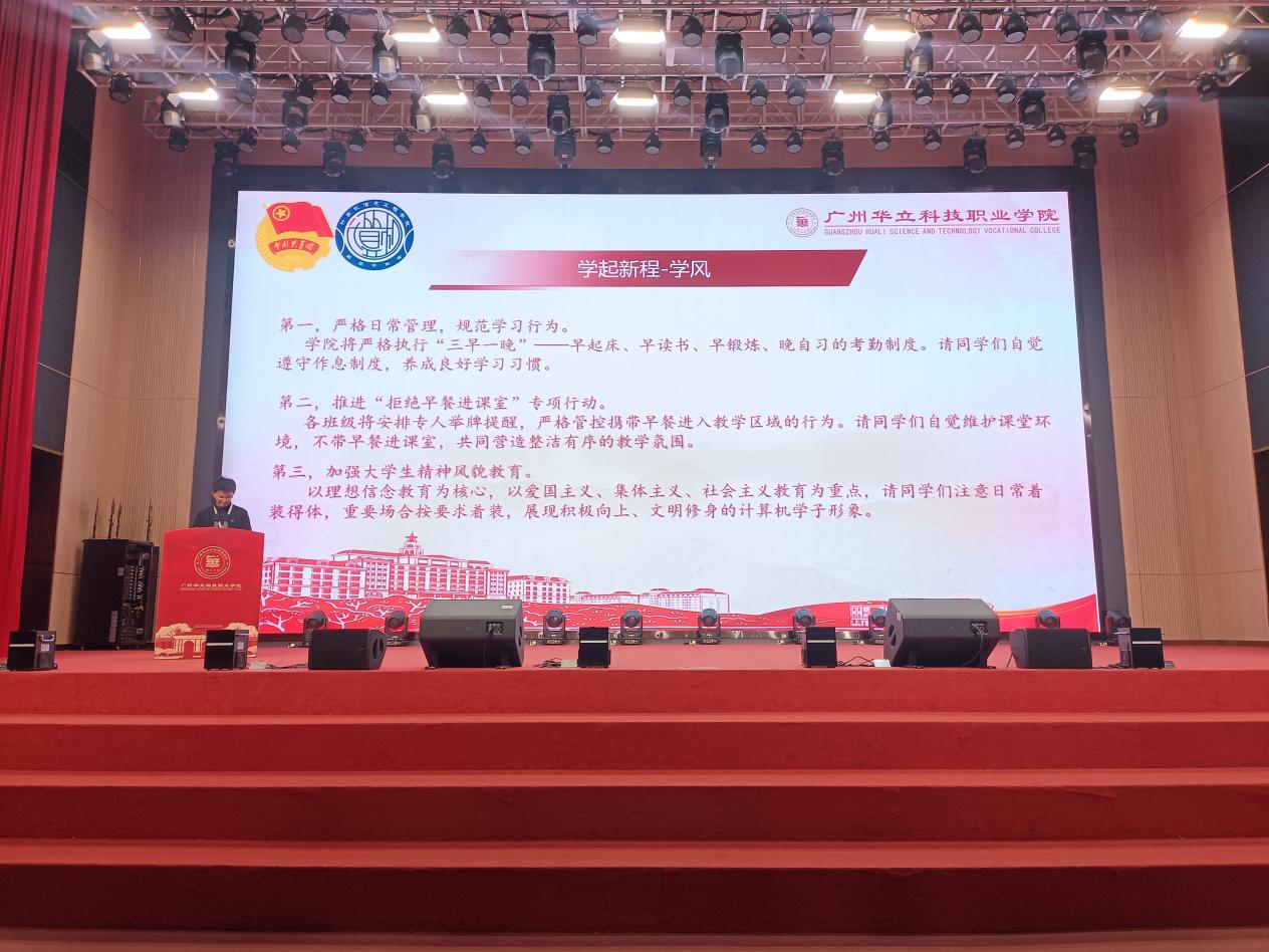 大會在莊嚴的國歌聲中拉開帷幕。云浮校區(qū)計算機學院院長助理黃志強老師在致辭中回顧了學院師生過去一學期在學術創(chuàng)新、體育競技、學生工作、志愿服務、文藝活動等方面取得的成績,勉勵大家繼續(xù)依托學院平臺,積極實踐、踏實進取。