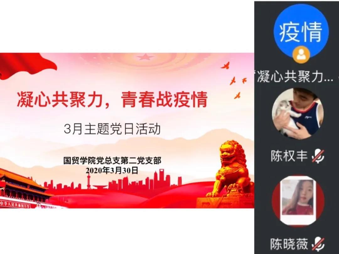 2020年3月30日星期一晚上七點,國貿(mào)學院黨總支第二黨支部在騰訊會議平臺開展了“凝心共聚力,青春戰(zhàn)疫情”組織生活會,參加本次會議的有國貿(mào)學院黨總支第二黨支部書記劉偉鑫老師、國貿(mào)學院黨總支第二黨支部組織宣傳委員陳權豐老師、國貿(mào)學院黨總支黨建小組指導老師陳曉薇老師以及國貿(mào)學院全體學生黨員。