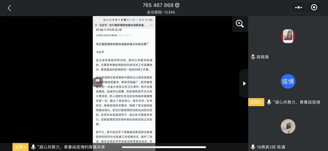 同時提醒了同學們在疫情期間做到不信謠不造謠,18級同學在家期間要遵守線上上課的規(guī)章制度,按時上課。17級在外實習的同學要注意安全。作為黨員要有當擔精神,要做到不忘初心。在會議中,國貿(mào)學院黨總支第二黨支部書記劉偉鑫老師給大家分享了報道習近平總書記《為打贏疫情防控阻擊戰(zhàn)提供強大科技支撐》的文章。此篇文章中提到了幾點如下: