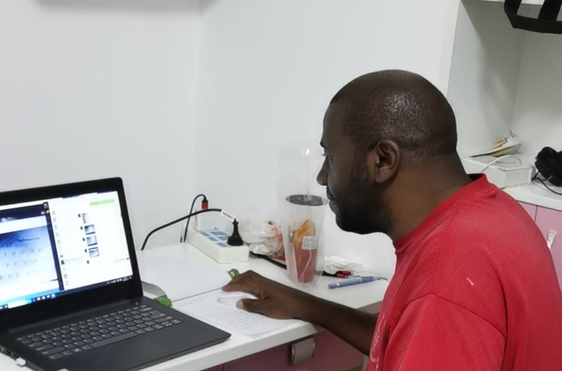 Sebastian老師,坐標(biāo)是哥倫比亞的首都和昆迪納馬卡省的省會波哥大。Sebastian老師在家也不停地研究平臺,適應(yīng)操作系統(tǒng)、備課、授課、講評,用一切可能的手段展示自己的課堂。哥倫比亞與中國的時差有13小時,我們早上上課時哥倫比亞已經(jīng)是晚上了。因此,他還要調(diào)整好自己晚上的時間來進行網(wǎng)絡(luò)教學(xué)。