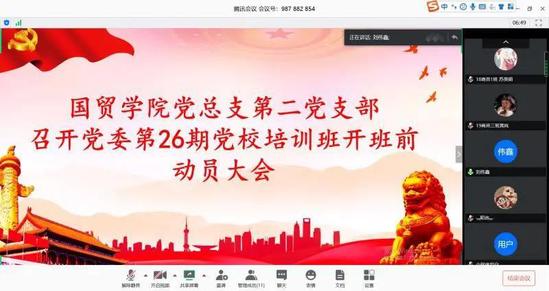 2020年5月7日晚上8:00,國(guó)貿(mào)學(xué)院在騰訊會(huì)議平臺(tái)開(kāi)展了第26期黨校培訓(xùn)班開(kāi)班動(dòng)員大會(huì),參加本次會(huì)議的有國(guó)貿(mào)學(xué)院黨總支第二黨支部書(shū)記劉偉鑫老師、國(guó)貿(mào)學(xué)院黨總支黨建小組指導(dǎo)老師陳曉薇老師以及國(guó)貿(mào)學(xué)院第26期黨校培訓(xùn)學(xué)員。