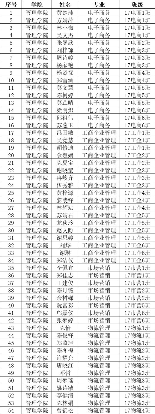 根據(jù)廣州華立科技職業(yè)學院下發(fā)《華立職院學〔2020〕21號關(guān)于評選2020屆優(yōu)秀畢業(yè)生的通知》,為表彰先進,進一步調(diào)動廣大同學們學習、就業(yè)的積極性,激發(fā)同學們奮發(fā)向上,創(chuàng)建良好的學風校風,在就業(yè)創(chuàng)業(yè)中努力進取,管理學院應(yīng)學校要求在2020屆畢業(yè)生中開展評選優(yōu)秀畢業(yè)生的活動。經(jīng)個人申請,管理學院輔導員、校外實習指導老師共同推薦,學院領(lǐng)導審核,我學院擬將推薦黃楚沛等54位同學為2020屆優(yōu)秀畢業(yè)生。現(xiàn)將2020屆優(yōu)秀畢業(yè)生的名單公示如下(具體名單見下表):