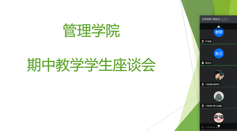 為了貫徹學(xué)院“創(chuàng)新強(qiáng)院、管院再出發(fā)”的發(fā)展理念,為進(jìn)一步提高學(xué)院教學(xué)質(zhì)量,掌握學(xué)院網(wǎng)絡(luò)教學(xué)動(dòng)態(tài),提升學(xué)院日常教學(xué)管理能力,管理學(xué)院于5月25日晚19:30,以騰訊會(huì)議方式召開(kāi)了本學(xué)期期中教學(xué)學(xué)生座談會(huì)。參加本次座談會(huì)的領(lǐng)導(dǎo)和老師有管理學(xué)院張良衛(wèi)(副)院長(zhǎng),戴玉林副院長(zhǎng),校內(nèi)教學(xué)主任康信恩老師,教務(wù)員以及2018級(jí)、2019級(jí)學(xué)生代表。本次座談會(huì)由康信恩老師主持。