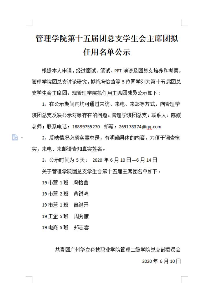 接著,由參會成員進行線上投票、檢票。管理學院團總支書記陳媛老師為大家宣布管理學院團總支學生會第十五屆主席團名單:曾繼開、黃銳鴻、馮怡茵、鄭志雲(yún)、周秀雁。
