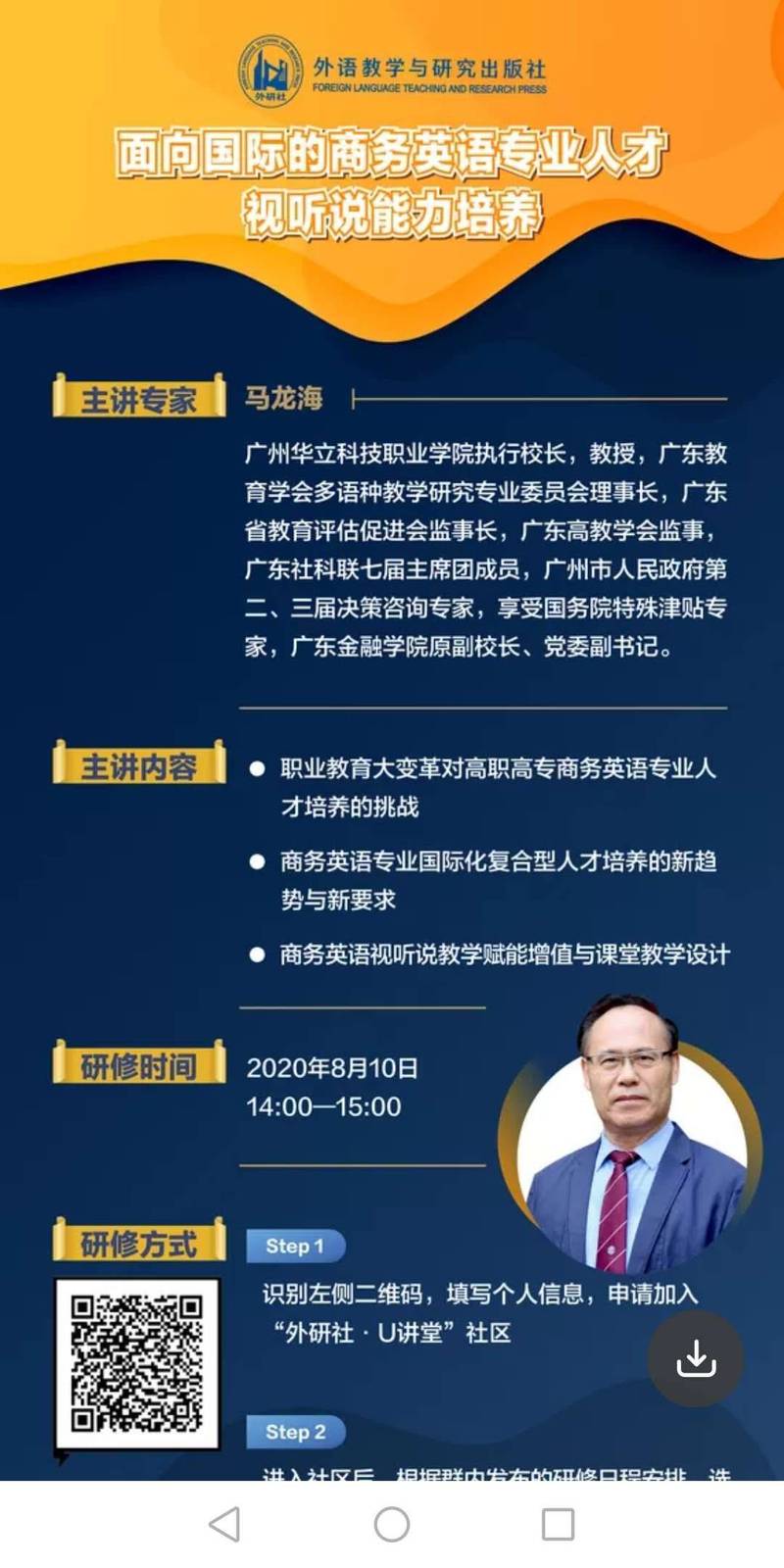 8月10日下午2:00,“外研社·U講堂社區(qū)”直播講座在釘釘群如期舉行。廣州華立科技職業(yè)學(xué)院馬龍海教授為大家?guī)砹恕睹嫦驀H的商務(wù)英語人才視聽說能力培養(yǎng)》主題講座。