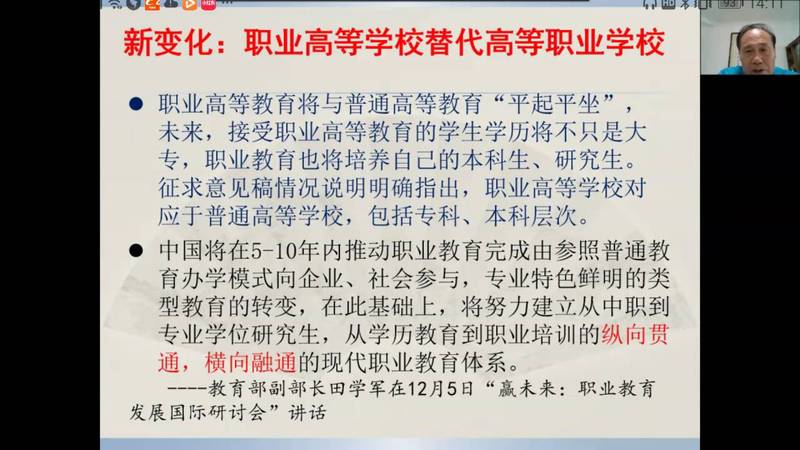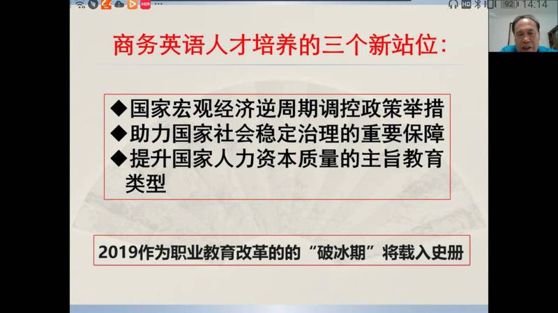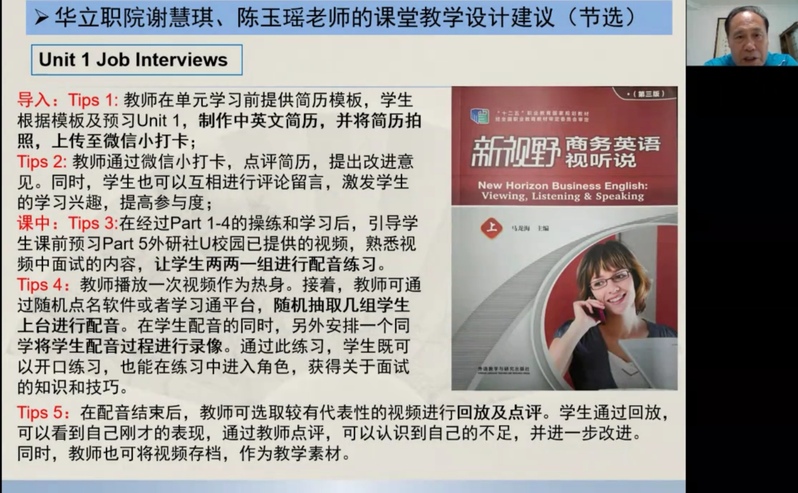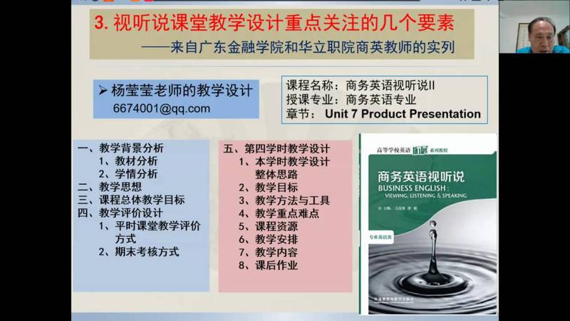 直播講座中,馬龍海教授就職業(yè)教育大變革對(duì)高職高專商務(wù)英語專業(yè)人才培養(yǎng)的挑戰(zhàn)進(jìn)行了詳細(xì)解讀,幫助教師深化了對(duì)職業(yè)教育大變革帶來的“三個(gè)新站位”,四個(gè)“新定位”的認(rèn)識(shí),并指出內(nèi)涵發(fā)展是適應(yīng)職業(yè)教育改革的必然選擇。分析了商務(wù)英語專業(yè)國際化復(fù)合型人才培養(yǎng)的新趨勢與新要求,要培養(yǎng)適應(yīng)現(xiàn)代化的復(fù)合型人才應(yīng)聚焦和回歸到課程改革,因?yàn)檎n程是學(xué)生消費(fèi)高等教育資源的基本單位,是高等學(xué)校一切辦學(xué)行為和人財(cái)物資資源配置的最終載體,是學(xué)校人才培養(yǎng)質(zhì)量內(nèi)涵建設(shè)水平的標(biāo)志和落腳點(diǎn),決定著學(xué)校品牌影響力與核心競爭力的形成。并從理念更新取向、體系構(gòu)建取向、教學(xué)能力取向、方法載體取向四個(gè)維度,就如何進(jìn)行課程建設(shè)提出建議。馬龍海教授強(qiáng)調(diào),在職業(yè)教育課程體系構(gòu)建的關(guān)鍵點(diǎn)是工作過程導(dǎo)向;教師要作學(xué)生成長的引路人,要注重交叉跨界能力;產(chǎn)教融合是職業(yè)教育的精髓和改革方向,在每一點(diǎn)的講解中,馬龍海教授都結(jié)合了《新視野商務(wù)英語綜合教程(智慧版)》或《新視野商務(wù)英語視聽說(第三版)》的教材編寫理念,以之為例,說明如何落實(shí)課程改革,如何培養(yǎng)商務(wù)復(fù)合型人才,如何結(jié)合現(xiàn)代化信息技術(shù)手段。商務(wù)英語視聽說教學(xué)應(yīng)進(jìn)一步明確培養(yǎng)目標(biāo),創(chuàng)新商務(wù)英語人才培養(yǎng);對(duì)標(biāo)教學(xué)效能標(biāo)準(zhǔn);打造適應(yīng)“新商科”發(fā)展需要的教師課程團(tuán)隊(duì);采用與時(shí)俱進(jìn)的教學(xué)方法和載體。并著重對(duì)商務(wù)英語視聽說課堂教學(xué)提出建議,為廣大教師講解了“肯普模式”的教學(xué)設(shè)計(jì)的框架結(jié)構(gòu),并指出視聽說課堂教學(xué)設(shè)計(jì)重點(diǎn)關(guān)注的要素,并分享和點(diǎn)評(píng)了廣東金融學(xué)院楊瑩瑩老師和華立科技職業(yè)學(xué)院謝慧琪、陳玉瑤老師的教學(xué)設(shè)計(jì)建議。當(dāng)前職業(yè)高等教育已經(jīng)發(fā)展到了國家戰(zhàn)略層面,職業(yè)教育從民生領(lǐng)域“置頂”于宏觀政策領(lǐng)域,就業(yè)導(dǎo)向的職業(yè)教育必須將自身的功能與國家和歷史的重任緊密相連。