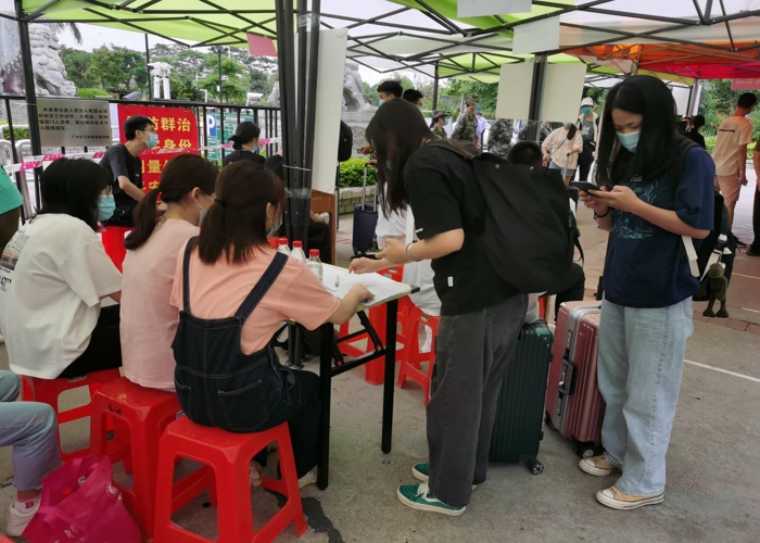 志愿者在校門口協(xié)助返校工作