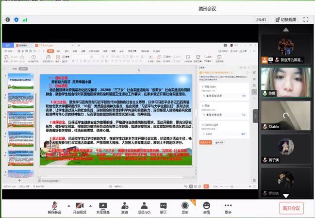 接著陳媛老師為我們介紹了以“青春助力脫貧,共奔幸福小康”為主題的“三下鄉(xiāng)”實(shí)踐活動(dòng),也為我們介紹了總體思路及注意事項(xiàng),她強(qiáng)調(diào)我們?cè)趨⑴c社會(huì)實(shí)踐活動(dòng)的同時(shí)要確保自己的安全,嚴(yán)格遵守當(dāng)?shù)匾咔榉揽匾?,盡量減少活動(dòng)半徑,面對(duì)新形勢(shì)新要求的情況下,同學(xué)們可以采取采取“云組隊(duì)”、“云訪談”等網(wǎng)絡(luò)形式開展。