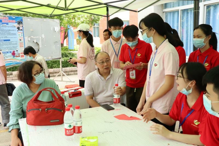 所謂“兒行千里母擔憂”,為了緩解家長們的緊張情緒,迎新工作人員與家長們愉快地交流,面對家長們提出的關(guān)于專業(yè)、宿舍等問題,迎新工作者積極、耐心地解答,為他們答疑解惑,同時表示可讓新生們多與師兄師姐們溝通,及時解決他們在校遇到的生活、學習問題。