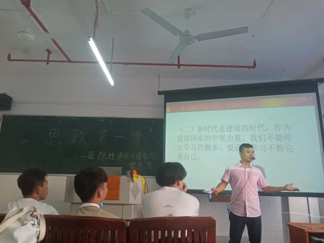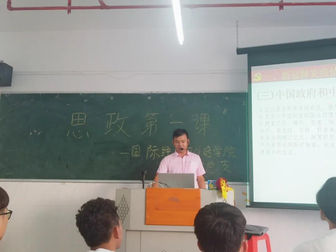 為了提高同學(xué)們對(duì)新冠肺炎疫情的防范性和學(xué)習(xí)的積極性,國(guó)際經(jīng)濟(jì)與外語(yǔ)學(xué)院黨總支于2020年9月20日下午4點(diǎn)10分在西一教學(xué)樓409開(kāi)展了思政第一課的活動(dòng)。參與人員有國(guó)貿(mào)學(xué)院黨總支黨建小組隊(duì)長(zhǎng)以及2020級(jí)新生。主題是“聚焦疫情防控,做學(xué)習(xí)型的新時(shí)代青年”。本次活動(dòng)由國(guó)貿(mào)學(xué)院第二黨支部書(shū)記劉偉鑫老師進(jìn)行演講。