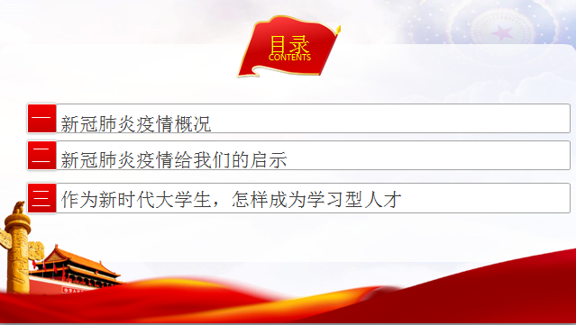 本次思政第一課的內(nèi)容分為三大部分:一、新冠肺炎疫情概況 二、新冠肺炎疫情給我們的啟示 三、作為新時(shí)代大學(xué)生,怎樣成為學(xué)習(xí)型人才。