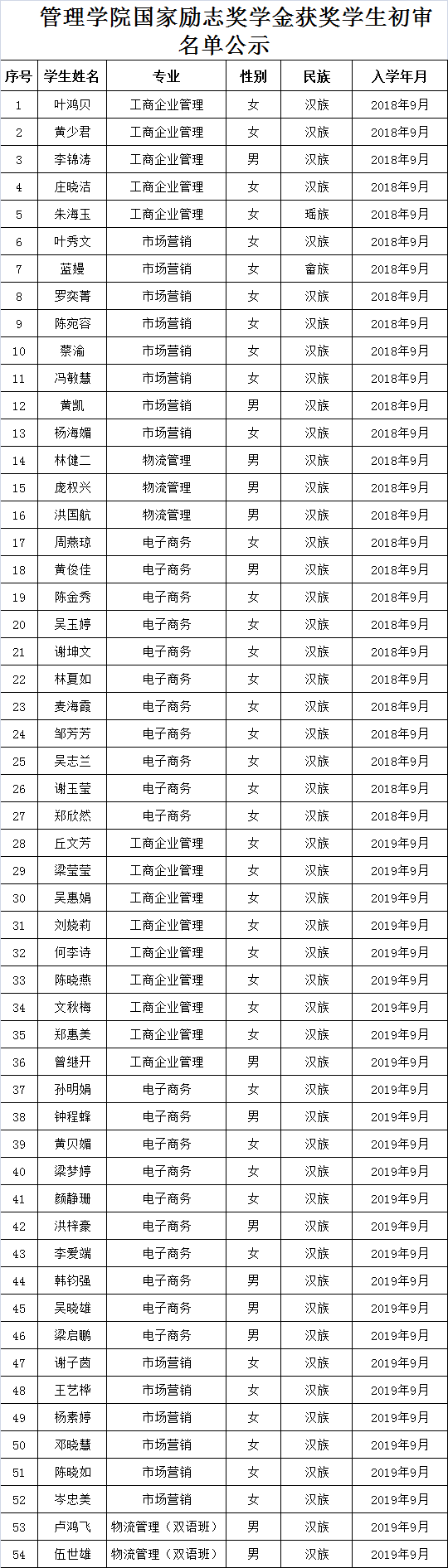 根據(jù)《關(guān)于做好我校2020學(xué)年國家獎助學(xué)金評審的通知》文件的有關(guān)要求,經(jīng)學(xué)生本人申請,各班級民主評議,學(xué)院評定小組審核,我學(xué)院擬推薦葉鴻貝等54位同學(xué)為2019-2020學(xué)年度國家勵志獎學(xué)金獲獎學(xué)生。按照公開、公平、公正的原則,現(xiàn)將推薦名單予以公示,公示期為2020年10月2日-10月6日,如有異議,請在公示期內(nèi)進(jìn)行反映。