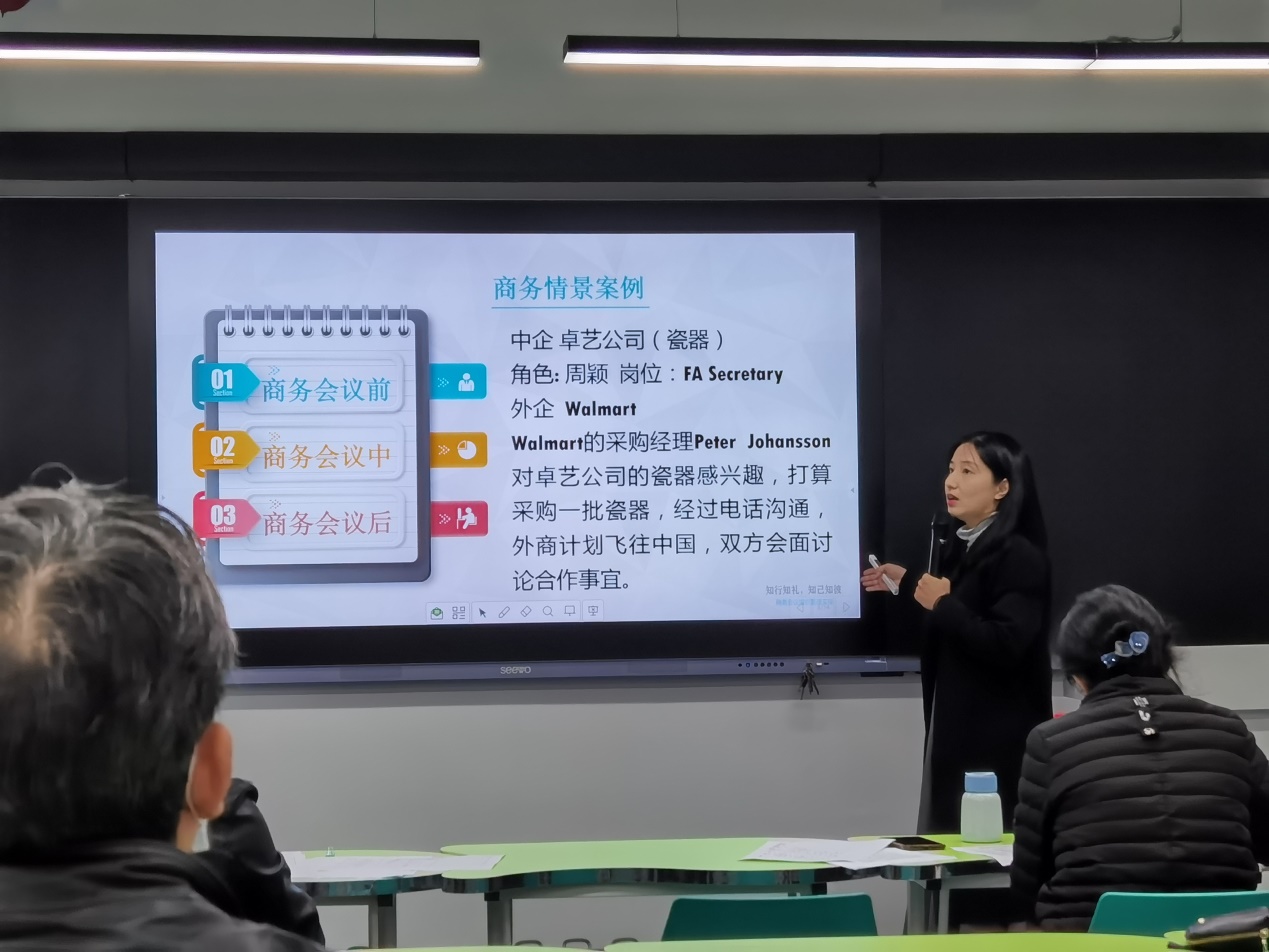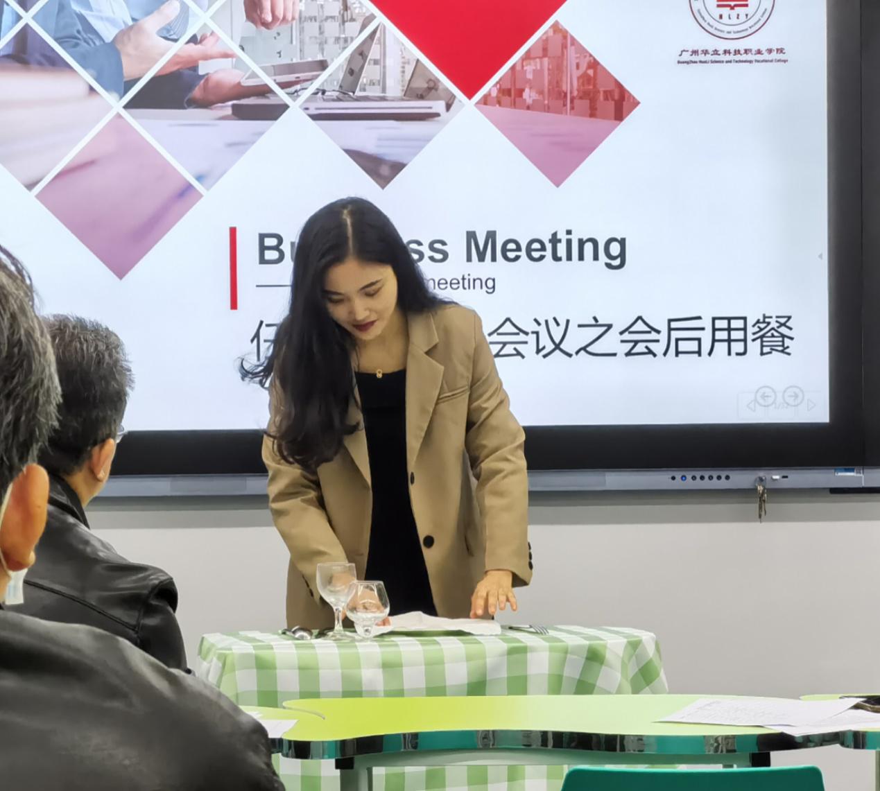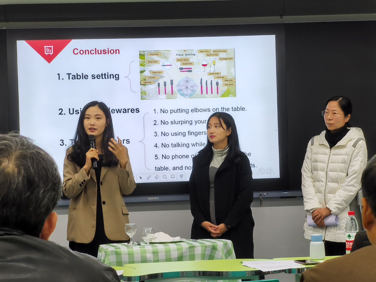 在說(shuō)課環(huán)節(jié),我院楊金玲老師圍繞教材、學(xué)情、教學(xué)目標(biāo)、教學(xué)重難點(diǎn)及教學(xué)過(guò)程等方面針對(duì)“商務(wù)會(huì)議之商務(wù)會(huì)議會(huì)后用餐”展開(kāi)闡述,語(yǔ)言流暢、教態(tài)自然、板書(shū)工整,以精彩的表現(xiàn)獲得了評(píng)委們的贊許,評(píng)委老師在肯定教師們?cè)鷮?shí)基本功的同時(shí)也提出了寶貴的意見(jiàn)和建議,本次教師能力大賽給參賽的教師提供了一個(gè)展示自我、挑戰(zhàn)自我,提高自我的機(jī)會(huì),促進(jìn)了青年教師教學(xué)能力的提升,營(yíng)造了濃郁的科組教研范圍,為我院教師的專業(yè)發(fā)展打下了堅(jiān)實(shí)的基礎(chǔ)。