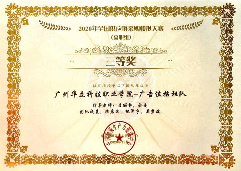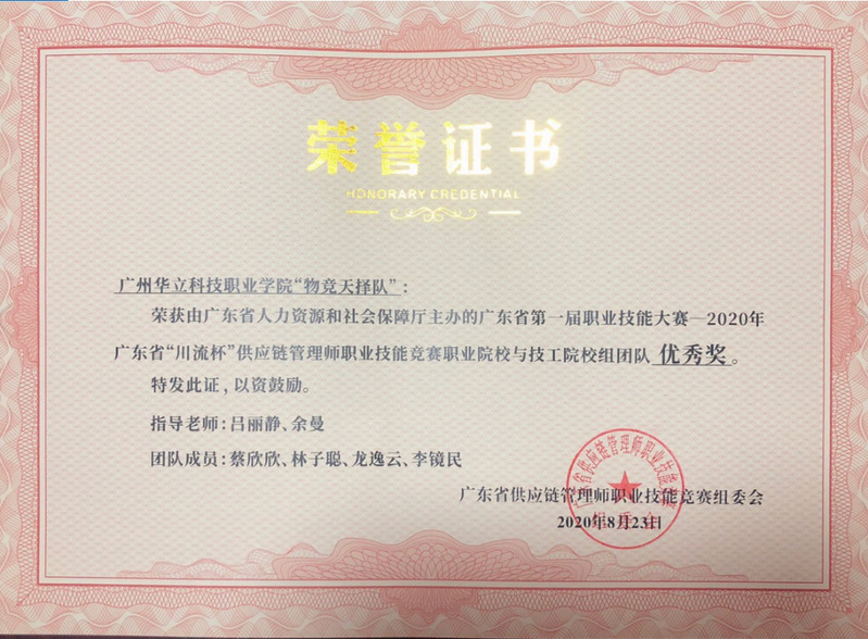 2020-2021學年第一學期,在全體物流老師和學生的努力下,在學生競賽和教師教學能力比賽上均有獲獎,其中學生競賽方面,參加了2020年全國供應鏈采購模擬大賽,獲得全國三等獎;參加2020年廣東省“川流杯”供應鏈管理師職業(yè)技能競賽,獲得優(yōu)秀獎。