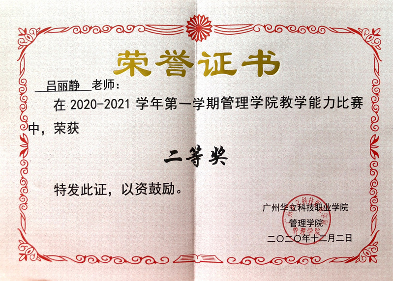 在教師教學能力競賽中,參加了管理學院舉辦的教師教學能力比賽,其中呂麗靜老師獲得二等獎。