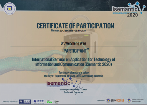 會議安排,溫偉勝博士應會議主席M.Arief Soeleman M.Kom博士邀請,參加了2020年9月19日在印尼努斯萬托羅大學舉行的“2020 International Seminar on Application for Technology of Information and Communication (2020信息與通信技術應用國際研討會)”的網(wǎng)絡平行會議,并被大會組委推選為項目委員會成員。通過與國內(nèi)外知名學者交流、學習,共建課題進行項目研發(fā),有利于汲取先進的文化和觀點,學習先進的技術和理念,培養(yǎng)國際視野、創(chuàng)新意識和溝通能力,提高學校、學科和專業(yè)的影響力。