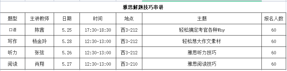 為提升我校學生雅思考試解題技巧,國際經濟與外語學院國際班教師將針對考試模塊進行串講,具體安排如下: