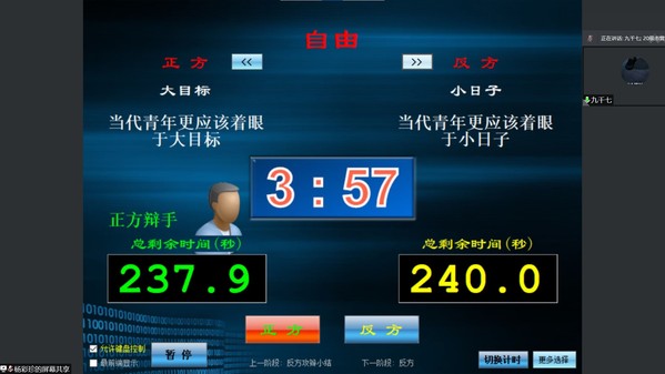 在本次辯論賽的決賽中,對(duì)陣雙方分別是持正方觀(guān)點(diǎn)“當(dāng)代青年更應(yīng)該著眼于大目標(biāo)”的20物流班以及持反方觀(guān)點(diǎn)“當(dāng)代青年更應(yīng)該著眼于小日子”的20市營(yíng)2班。在分別進(jìn)行自我介紹以后,辯論賽即將拉開(kāi)帷幕。按照新加坡賽制,正、反雙方一辯各自提出自己的立論,隨即進(jìn)入一對(duì)一攻辯環(huán)節(jié),然后是精彩的自由辯論環(huán)節(jié)。在這個(gè)環(huán)節(jié)中,雙方勢(shì)均力敵,進(jìn)行了唇槍舌戰(zhàn),隨著鈴聲的響起,這一環(huán)節(jié)在雙方對(duì)手不可開(kāi)交的辯論中結(jié)束。