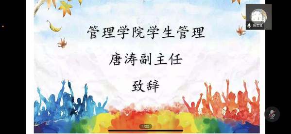 2021年6月17日于線上騰訊會議舉辦管理學院團總支學生會第十五屆總結(jié)暨換屆大會,參加本次會議的領(lǐng)導和嘉賓有管理學院管理副主任唐濤老師、管理學院團總支書記陳媛老師、輔導員戴雙雅老師、輔導員熊靈芝老師、輔導員張南南老師、輔導員鄧念平老師、輔導員吳小宇老師、管理學院團總支學生會第十五屆主席團成員以及新一屆主席團成員和各部門部長和成員。