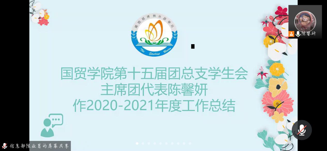 光陰如梭,一年的工作轉(zhuǎn)瞬又將成為歷史,新的一年意味著新的起點(diǎn)新的機(jī)遇新的挑戰(zhàn)。2021年6月19日19點(diǎn)30分在騰訊會(huì)議舉行國(guó)貿(mào)學(xué)院團(tuán)總支學(xué)生會(huì)第十五屆總結(jié)交流換屆大會(huì)。