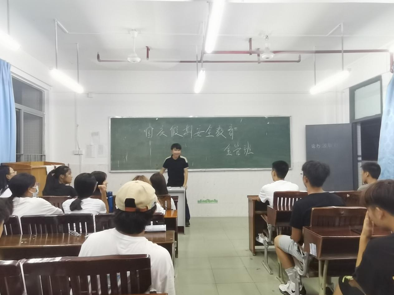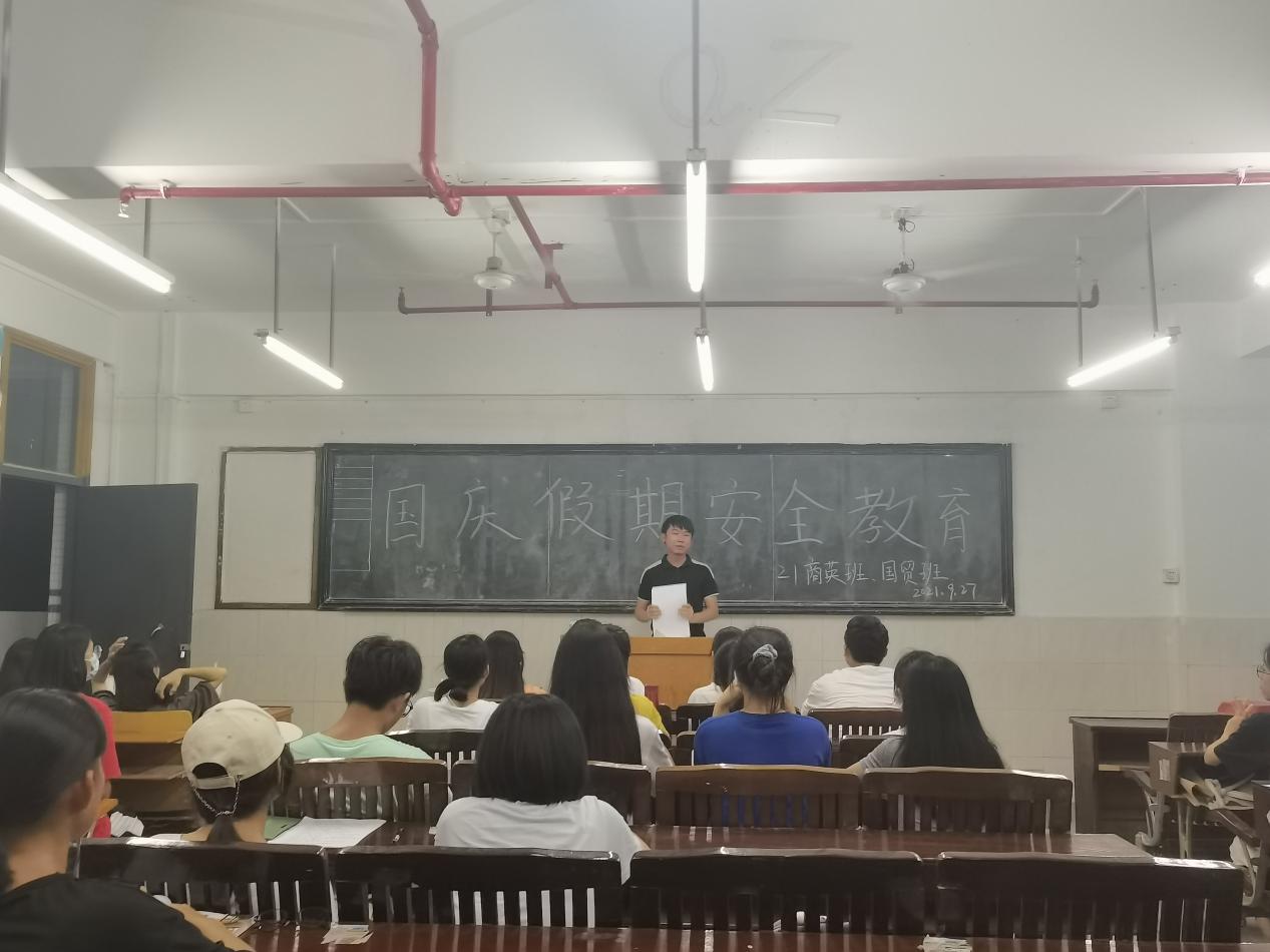 一年一度的國慶節(jié)即將來臨,為讓全體學(xué)生度過一個安全有意義的假期。2021年9月27日,財經(jīng)學(xué)院21級輔導(dǎo)員鄭慶國老師在各班開展了國慶節(jié)放假主題班會,對同學(xué)們進行了假期安全教育。